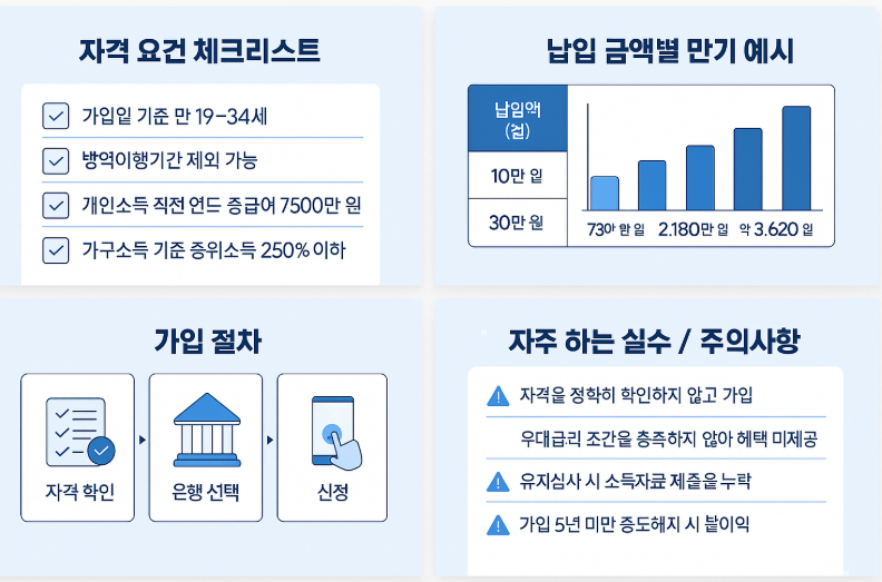 - 대상: 가입일 기준 만 19~34세(병역이행기간 최대 6년 제외 가능) + 소득·가구소득 요건 충족.