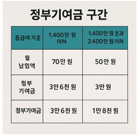 - 정부기여금: 월 납입액·소득구간에 따라 월 최대 33,000원 지급.